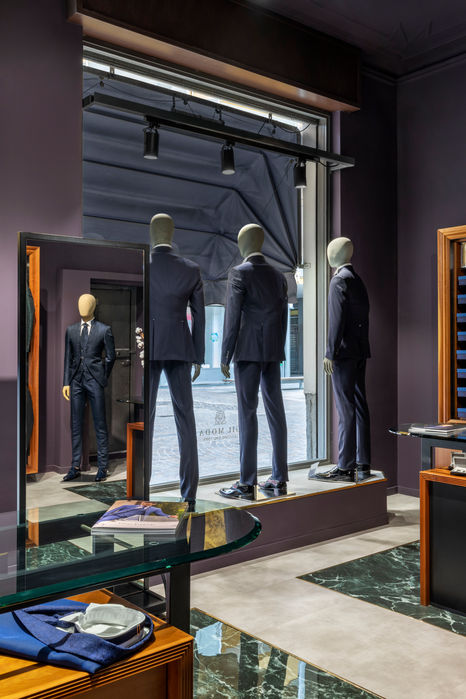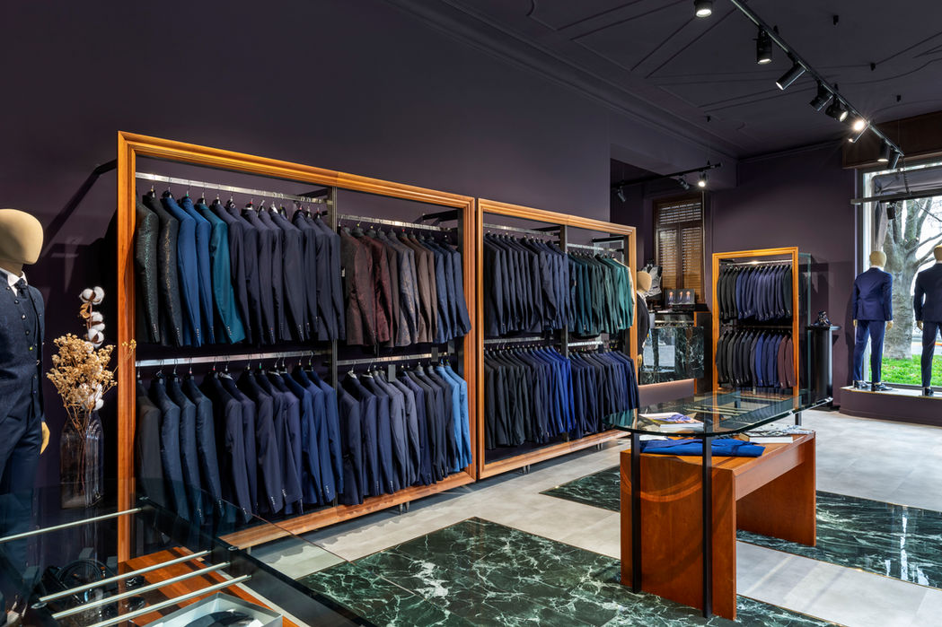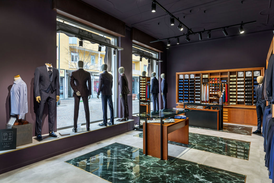 Linee classiche, dettagli contemporanei e materiali pregiati danno vita a uno spazio che accompagna il cliente con armonia e stile verso il cuore del progetto: la sartoria.